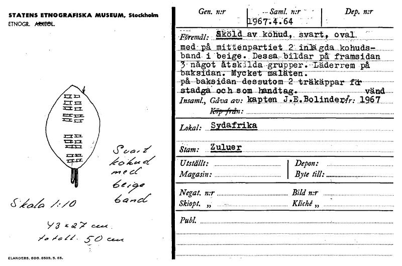 STATENS ETNOGRAFISKA MUSEUM, Stockholm ETNOGR. ~ML. 3 k 02 . "la /*/ • ,5”- ELANDERS. GBG. 8503.5. 65. Gen. mr : I - -Saml. n:r - - I Dep. n:r 11967";4..64 Föremål äköld_av -- : . köhud.,. svart, oval. 2: iii»: gda .kohuds- Des-sa,bildar på framsidan -grtipper äderrem på maläten. 2 träkäppar fti- handtag. vänd. kapten J.E.Bolinderir: 1967 med- på. mittenpartiet band, i beige. .3 något åt skilda -baksidan. Mycket på baksidan dessutom „stadga. och-som Insaml., Gåva av: lety-frrin: Lokal: Sydafrika Stam: Zuluer Utställt: .Magasin: I Depon: I Byte till: Negat. n:r Bild n:r Skiopt. ,, Kliché,, Publ. [ocr]