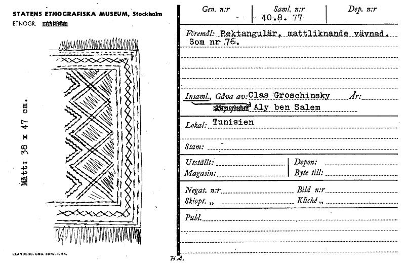 7-i , 44 STATENS ETNOGRAFISKA MUSEUM, Stockholm ETNOGR. Gen. n:r Saml. n:r -. 40-_.a.- 77: Dep. n:r Föremdk...Rektangulär, Som nr ,76. In—saml, Gåva av:Clas mattliknande vävnad. -Groschinsky År:, Aly ...