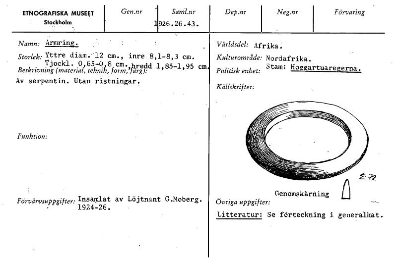 ETNOGRAFISKA MUSEET Stockholm 1 Gen.nr Saml.nr926.26.43. Dep.nr Neg.nr Förvaring Namn: Armring• Storlek: Yttre diam. 12 cm., inre 8,1-8,3 cm. Tjock'. 0,65-0,8 cin•,b.redd 1,85-1,95 cm Beskrivning (material, teknik, form, farg): Av serpentin. Utan ristningar. Funktion: Förvärvsuppgifter: . Insamlat av Löjtnant G.Moberg. 1924-26. Världsdel: Afrika. Kulturområde: Nordafrika. Politisk enhet: Stam: Hoggartuaregerna. Källskrifter: Genomskärning Övriga uppgifter: Litteratur: Se förteckning i generalkat. [ocr]