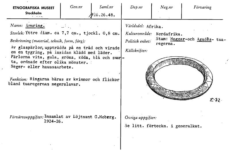 • ETNOGRAFISKA MUSEET Stockholm Gen.nr Saml.nr 2.6.26.48. Dep.nr Neg.nr Förvaring Världsdel: Afrika. Namn: Armring.. Storlek: Yttre diam. ca 7,7 cm., tjockl. 0,8 cm. Kulturområde: Beskrivning (material,... Visa hela