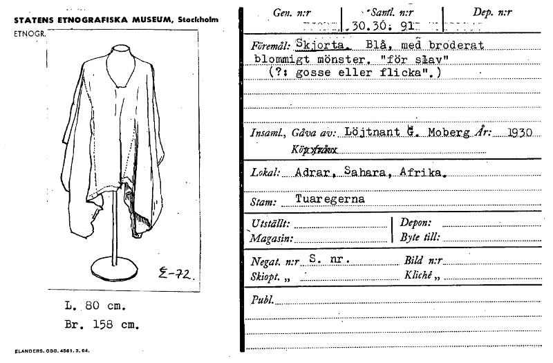 STATENS ETNOGRAFISKA MUSEUM, Stockholm ETNOGR. L. 80 cm. Br. 158 cm, ELLAND ERS. OBG. 4561.5. 64. Gen. n:r 7.7::::,.., ' -Sand. mr 30.3.0; 9.17 Dep. n:r Föremål: kjorta., Blå, med broderat blommigt mönster, "för slav" (?: gosse eller flicka".) Insaml„ Gåva av: Löjtnant b. Moberg fr: 19.30.— Köpfxd7x. Lokal: Adrar., Sahar.a., Afrika.. Stam: Tuaregerna Utställt: I Magasin: Depon: I Byte till: Negat. n:r S• nr • Bild n:r • Skiopt. „ ' Kliché,, Publ. • . • [ocr]