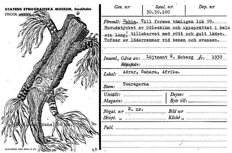 • STATENS. ETNOGR ISKÅ MUSEUM, Stockholm ETNOGR. Gen. n:r ' SaMl. n:r Dep. n:r 30.30.100I Föremål: 24131A, TIII Oxilen tämligen lik 99. Huvudstycke av ödleskinn och uppsprättat...1 hela ....ain....i.ä... Visa hela