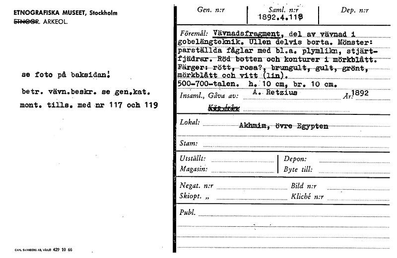 • Katalogkort från Etnografiska museets arkiv.