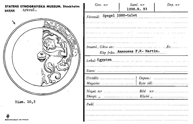 • STATENS ETNOGRAFISKA MUSEUM, Stockholm !ffifErdk Arkeol. Gen. wrSaml. i 1898.9. 93 Föremål: Spegel 1000-talet Dep. n:r Diam. 10,3 4 - Insaml., Gåva av: År: Köp från: Amanuens F.R- Martin Lokal: Egypt... Visa hela