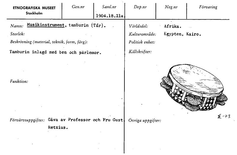 ETNOGRAFISKA MUSEET Stockholm Gen.nr Saml.nr 1904.18.21a Dep.nr Neg.nr Förvaring Namn• Musikinstrument, tamhårin (Tår). Storlek: Beskrivning (material, teknik, form, färg): Tamburin inlagd med ben och...
