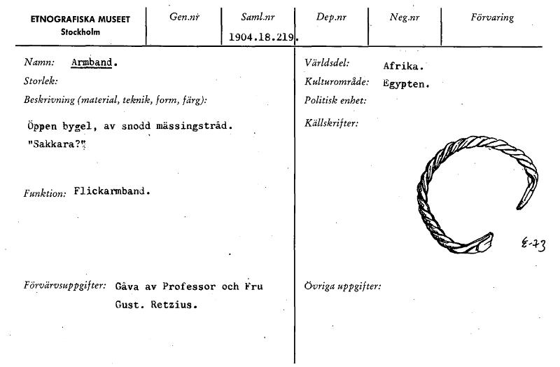 • ETNOGRAFISKA MUSEET Stockholm Gen.nr Sarnl.nr 1904.18.219 Dep.nr Neg.nr Förvaring Namn: Armband. Storlek: Beskrivning (material, teknik, form, färg): Öppen bygel, av snodd mässingstråd. "Sakkara?" Fun... Visa hela
