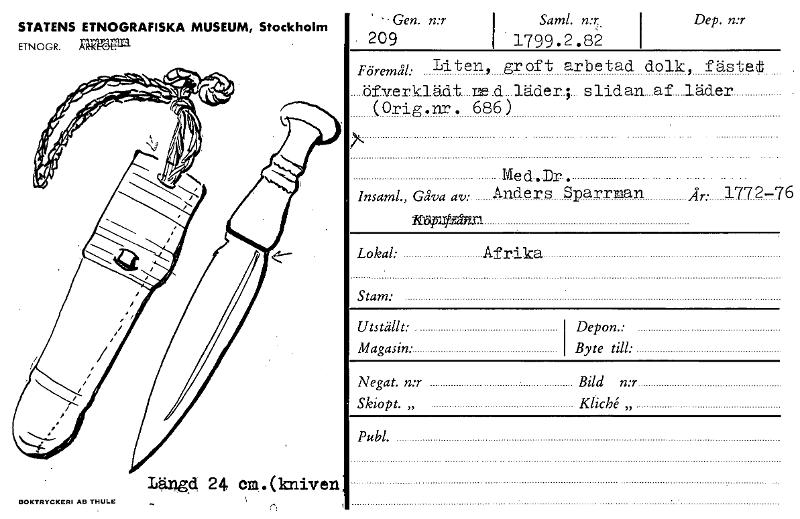 STATENS ETNOGRAFISKA MUSEUM, Stockholm ETNOGR. Wg&T.12. Dep. n:r • Gen. n:r • 209 ISaml. n:r, 1799.2.82 Föremål: Liten, groft arbetad dolk, fästet öfverklädt ned läder; slidan af läder (Orig.nr. 686...