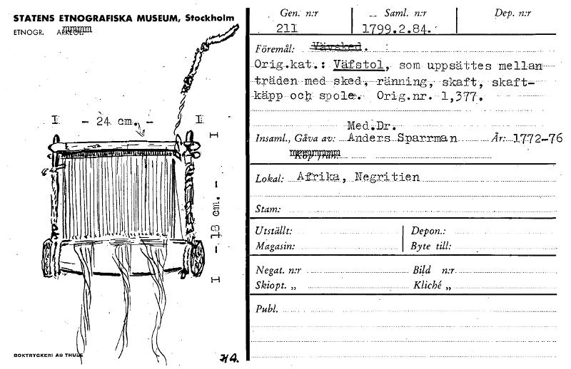 Utställt: Magasin: Depon.: ... Byte till: . Gen. n:r Samt. n:r 211 i 1799.2.8•' Föremål: : Väfstol som-uppsättes mellan -träden med sked, räng r , • skaft-, skaft- -käpp----octr- -spole? :å-- Orig. nr. --1,377.•0 Med.Dr. Insaml., Gåva av: Anders.. Sparrma .... År: .... 177 2-7 6 ~1,1.1)Ra Lokal.- Afkdka , Ne gri t ie n Stam: Negat. n:r Bild n:r. Skiopt. „ Kliche „ Publ. STATENS ETNOGRAFISKA MUSEUM, Stockholm ETNOGR. AfRIBP1 Dep. n:r BOKTRYCKERI AB THU 44. — 24, — ed [ocr]