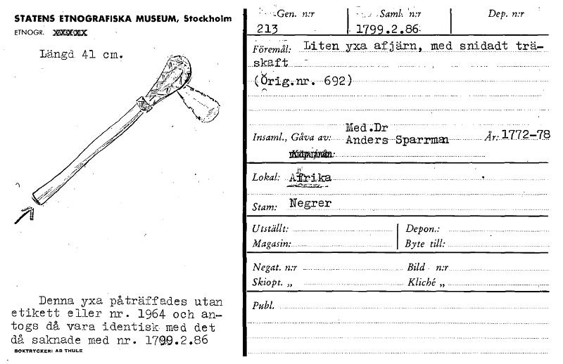 STATENS ETNOGRAFISKA MUSEUM, Stockholm ETNOGR. DMEOCIX - • n:r- '22:r I 213 - 1799.2.86 Dep. n:r Längd 41 cm.. Föremål: Liten yxa afjärn, med snidadt trä- skaft Orig.nr. 692) Med.Dr Insaml., Gåva av. Anders Sparrmal År:_1772-78 Lokal: Attika xStam: Negrer Utställt: Magasin: Depon.: Byte till: Denna yxa påträffades utan etikett eller nr. 1964 och an- togs då vara identisk med det då saknade med nr. 1799.2.86 Negat. n:r Bild - n:r Skiopt. „ Kliche „ Publ. BOKTRYCKERI AB THULE [ocr]Stäng