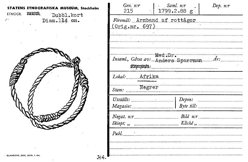 • .ELANDERS.GBG.3079.1.M Geff.. n:r 215 •- I - . Sand. n:r _ 1..1799.2.88 g. Dep. n:r Föremål: Armband af rottågor (Orig.nr, 697). Me-d .Dr. Insaml„ Gåva av: A.nd6rs Sparrman jr: 4~1: 'Lokal: Afrika ... Visa hela