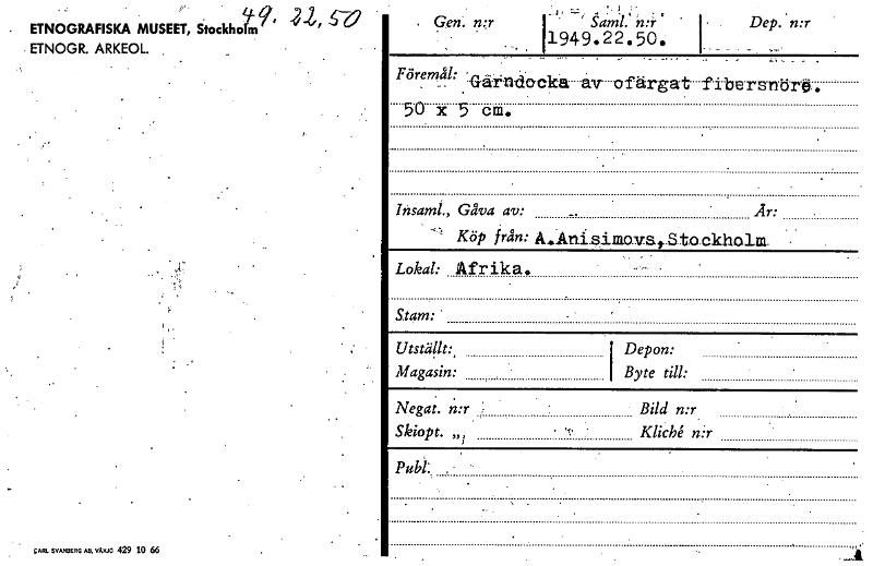 • 7. ETNOGRAFISKA MUSEET, Stockho m1, ETNOGR. ARKEOL. . . Gen. n:rI S'aml.' n:r • 1. Dep. n:r . , •1949.22.50, . Föremål:s-airhlycka av—ofärgat fibersnörti. 50 x 3 cm. Insaml., Gåva av: År: Köp irån: A ..An i simovat S to ckholm Lokal: Afrika. Stam: Utställt:, Depon: Magasin: I Byte till: Negat. n:r ; Bild n:r Skiopt. • `1• • CARL SVANBERG AB. VÄRJO 429 10 66 [ocr]