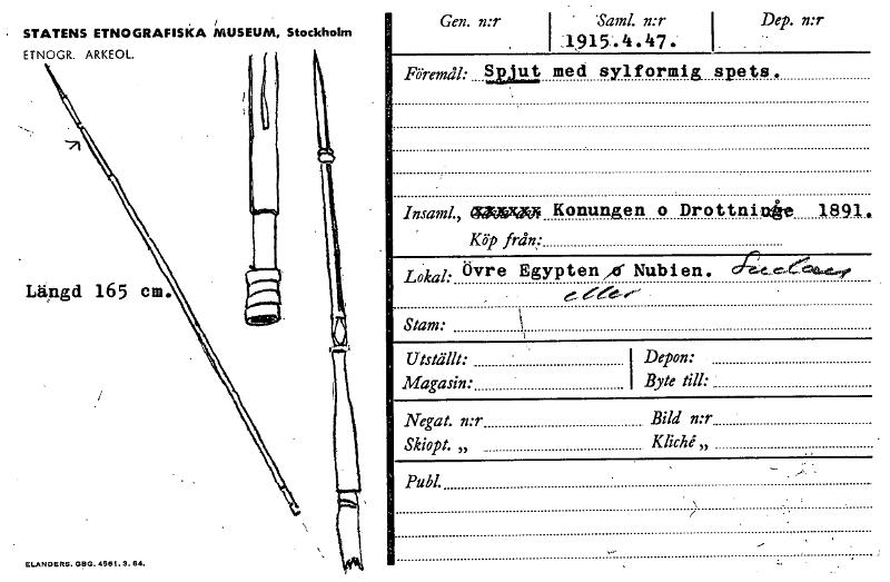 • • STATENS ETNOGRAFISKA MUSEUM, Stockholm ETNOGR. ARKEOL. ELAND ERS. 013G. 4551.9.64. Gen. n:r "Sam'. n:r A915.4.47. , Dep. n:r Föremåk...gpjut med sylformig spets. Insaml„ ~kW Konungen o Drottninite... Visa hela