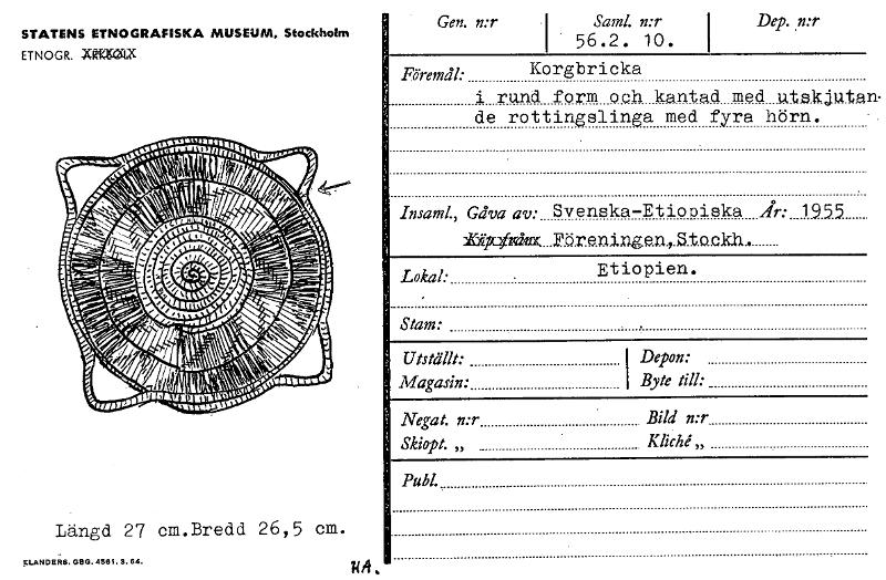 • STATENS ETNOGRAFISKA MUSEUM, Stockholm ETNOGR. Xfkra0.3 • Gen. n:r Saml. n:r I 56.2. 10. Dep. .n:r Föremål: Korgbricka i rund form och kantad med utBkjutal de rottingslinga med fyra hörn. Insaml„ Gåv... Visa hela