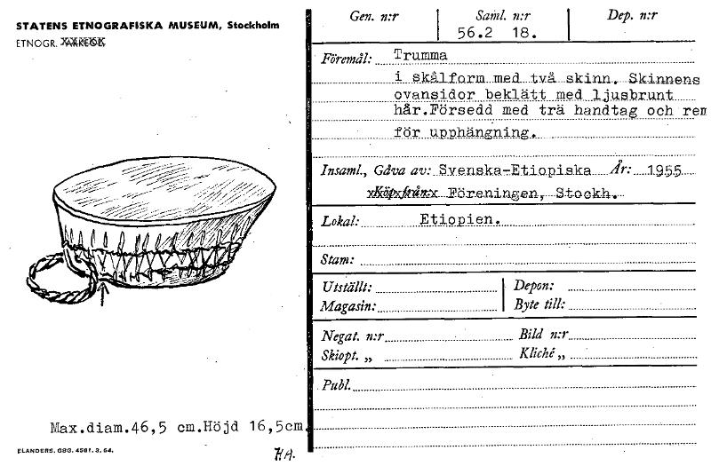STATENS ETNOGRAFISKA MUSEUM, Stockholm ETNOGR. AUTI§K fl Gen. n:r I Sand. n:r 56.2 18. Dep. n:r Föremil: Trumma i skålformmed två_skinn_Skinneru ovansidor beklätt med ljusbrunt hår.Försedd med trä handtag och•rE för upphängning, • Insaml., Gåva av: __2 ... enskamEtio.pi.ska År: 19.5 ...... xktkinåx_Före.ningen„Stookh, Lokal: Etiopien. Stam: Utställt:. Magasin: I Depon: I Byte till: Negat. n:r Bild n:r Skiopt. „ Kliché,, . Publ. Max.diam.46,5 cm.Höjd 16,5cm ELANDERS. GBG. 456f.3. 64. 7. [ocr]