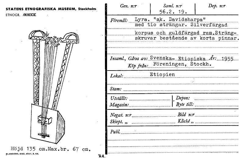 STATENS ETNOGRAFISKA MUSEUM, Stockholm ETNOGR. DE= Gen. n:r . I Saml. n:r. 56.2. 19. Dep. n:r Föremål: Lyra. "sk. Davidsharpa" med tio strängar. Silverfärgad korpus och guldfärgad ramSträng- skruvar bestående av korta pinnar. hisam4 Gåva av: Svenska— Etiapiska_iirv_ .... 1955 Köpfkin: Föreningen, Stockh. Lokal: Etiopien Stam: Utställt: Magasin: • Depon: I Byte till: • Negat. n:r Bild n:r Skiopt. „ Kliché,, Publ. Höjd 135 cm.Max.br. 67 cm. FLANDERS. GBG. 4561.3. 64. 114 [ocr]Stäng