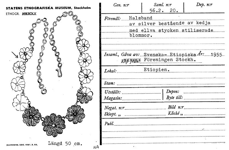 • STATENS ETNOGRAFISKA MUSEUM, Stockholm ETNOGR. »SM plANDERS. GEM. 4561.3.64. Längd 50 ,cm. HA Gen. n:r Saml. n:r i 56.2. 20. Dep. n:r Föremål: Halsband av silver bestående av kedja med eliva stycken ... Visa hela