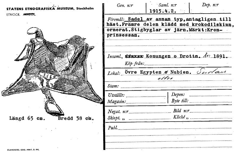 • BLANDERS. GBG. 4561. 3, 64, STATENS ETNOGRAFISKA MUSEUM, Stockholm ETNOGR. "CM. Längd 65 em. Bredd 38 oh. Gen. n:r I ' .Saml. n:r ' I 1915;44. - : I Dep. n:r Föremål: Sadel av annan typf.antaglig.e.n.... Visa hela