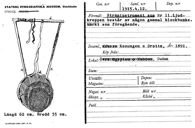 STATENS ETNOGRAFISKA MUSEUM. Stockholm ETNOGR. Längd 62 cm. Bredd 35 cm. ELAND ERS, GBG. 4561.9.64. Gen. n:r I ...11915..4..12. - • Saml. n:r Dep. n:r Föremål: Sträninstruuent sota Yr 11...Ljud- bleckbunke. kroPpen består av någon gammal Märkt som föregående. Insaml., ~XXI: Konungen 0 Drettn.,...A_.18.91....... Köp från: Lokal: 617:1E93°~9~~ • Sudan . . - Stam: Utställt: Magasin: I Depon: I Byte till: Negat. n:r Bild n:r Skiopt. „ Klicht, „ • Publ. [ocr]Stäng
