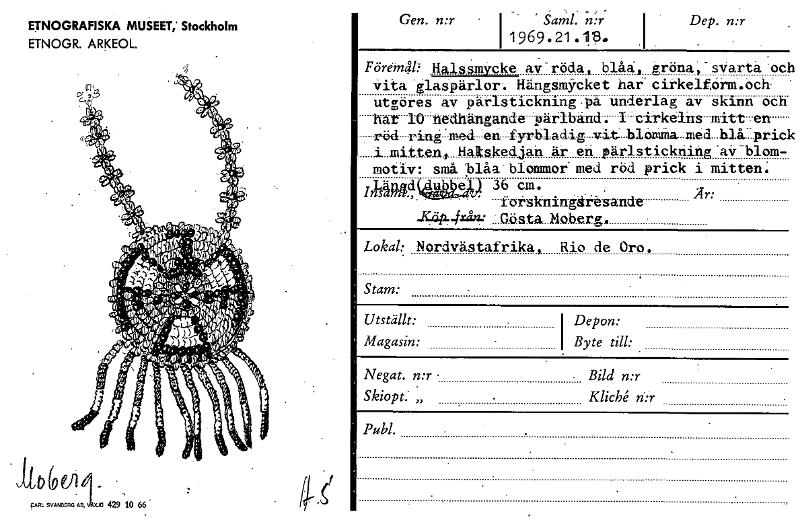 ETNOGRAFISKA MUSEET,' Stockholm ETNOGR. ARKEOL. lit. eA • • CARL SVANBERG AD, AXJD 429 10 66 Gen. n:r • ' Saml. nr 1969.21.18. ,I I • Dep. n:r . • Föremål: Haiså irtSreke, av-röda, blåa,. gröna, - svarta •ocl Vita 'glaspärlor. Hängsmycket har' cirkelform.och utgöres av pärlstickning •på underlag av skinn och hat 10 nedhängande 'pärlband. I -cirkelns mitt-en röd -ring' med .en fyrbladig vit- hlänäia-med...hlå:pricJ i. mitten., Halskedjan är en pärlstickning 'air -blom- motiv: små. :blåa blommor' med röd prick i mitten. •Längd(Alubbel.) 36 cm. i nsarre. wo, Är: • -foisktinåårtgande -K44-44273.: ...Gösta..itiob.e.rgi fl Lokal: Nordvästafrika, Rio de Oro. Stam: • . Utställt:. Magasin: fl i Depon: Byte till: • . - Negat. n:r • • Bild n:r • Skiopt: „Kliché' n:r . Publ. . • . . . . . [ocr]