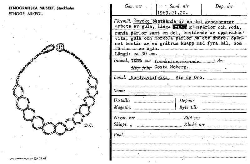 ETNOGRAFISKA MUSEET, Stockholm •ETNOGR. ARKEOL. Gen. n:r Saml. n:r Dep. n:r Föremål: smycke 'bestående aV ett del genombrutet arbete av gula,, långa wiliffi glaspärlor och röda, runda pärlor samt en del, bestående'av Uppträdda' vita, gula och rnörkbla parlor på ett snore. Span- --ne-t- -bes-tår- av eri --gråbrun- knapp med fyra hål, som fäs-tas i en ögla. Längd:. ca 30 cm. Insaml., attra av: forskningsresande • Är: triip--från7 Gösta Moberg. Lokal: Nordvästafrika, Rio de Oro. Stam: Utställt: . I Depon: Magasin: .1 Byte till: Negat: n:r Bild n:r Skiopt „ Kliché n:r Publ. EARL SVANBERG AB, VÄXJÖ 429 10 66 [ocr]