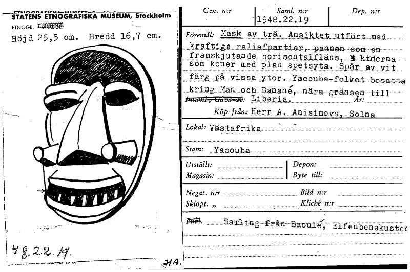 ----WEZSAinfähältÄgila MUSEUM, Stockholm ETNOGR. n111 Höjd 25,5 cm. Bredd 16,7 cm. Gen. n:r 1 Saml. n:r -11948.22.19 Dep. n:r Föremål: _,11å.åk av trä. Ansiktet utfört_med kraftiga reliafpartier, pannan sam-en. framskjutande horisontalflaaa, lit_kiderna som koner med plan spetsyta. Spår av vit färg på vissa ytor. Yaccuba,folket-bosatta krifig_Man och-Danang, nära gränsen till ~c-a: Liberia. Ar Köp- från: Herr i. Anisimovs, Solna Lokal: Västafrika Stam: ...Yacouba Utställt: Depon: Magasin: Byte till: Negat. n:r Bild n:r Skiopt. „ Kliché n:r i. Samling från Baoul4 Elfenbenskuster [ocr]