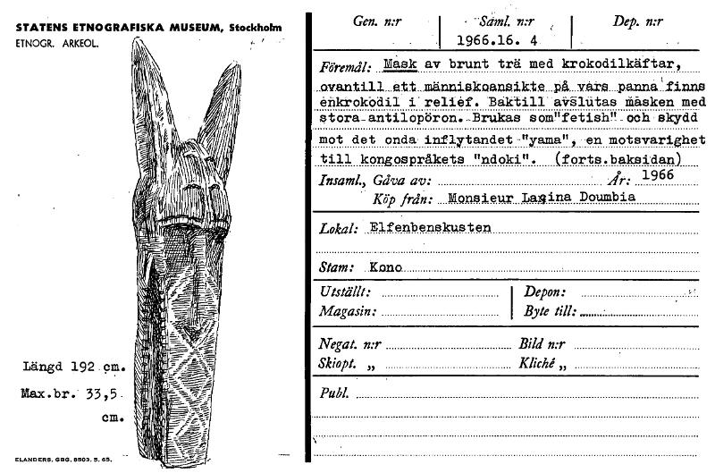 STATENS ETNOGRAFISKA MUSEUM, Stockholm ETNOGR. ARKEOL. Längd 192 cm. Max.br. 33,5 Ill • ELANDER8.080.8503.5.85. Gem MT. . .. ,-.9tind. n:r 1966.16. 4- I Dep.mr Föremihyask av brunt trä med krokodilkäftar, Baktill-alUtas masken me sonPfetishooh.skydd -"yama", --en motsvarighe. "ndoki". (forts.baksi'dan) . År: 1966Monsieur Laxbina Doumbia ...astantill...ätt...märuaiakoansikte...0,...ItAte....pannikt.finn e.hkrokbdil i'relif. stora-antilopöron.-Brukas mot det onda. inflytandet till kongospråkets Imud, Gåva av: ICiipftå: Lokal: Elfenbenskusten Stam: .Kono Utställt: Aggashl: I Depon: i Byte till: Negat. n:r Bild n:r • Skiopt. „ Kliché,, Publ. [ocr]