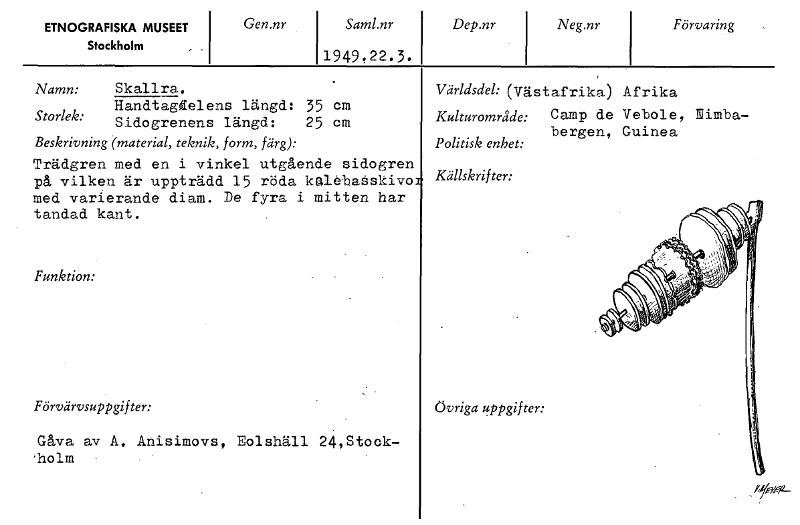 ETNOGRAFISKA MUSEET Stockholm Gen.nr Saml.nr 1949.22.3. Dep.nr Neg.nr Förvaring Namn: Skallra. Handtagdelens längd: 35 cm Sidogrenens längd: 25 cm Beskrivning (material, teknik, form, färg): Trädgren med en i vinkel utgående sidogren på vilken är uppträdd 15 röda kalebaåskivo med varierande diam. De fyra i mitten har tandad kant. Funktion: Förvärvsuppgifter: Gåva av A. Anisimovs, Eolshäll 24,Stock- 'holm Världsdel: (Västafrika. ) Afrika Kulturområde: Camp de Vebole, lUimba- Politisk enhet: bergen, Guinea Källskrifter: Storlek: Övriga uppgifter: i<57t7g- [ocr]