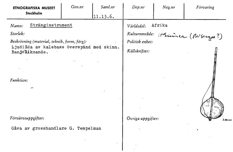 • ETNOGRAFISKA MUSEET Stockholm Gen.nr Saml.nr 11.13.6. Dep.nr Neg.nr Förvaring Världsdel: Afrika Kulturområde: Politisk enhet: Källskrifter: Övriga uppgifter: ‘el 410 ?) Namn: Stränginstrument Storlek:... Visa hela