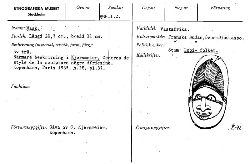 ETNOGRAFISKA MUSEET Stockholm Gen.nr Saml.nr /73611.2. Dep.nr Neg.nr Förvaring Världsdel: Västafrika. Kulturområde: Franska Sudan,ijobo-Dioulasso. tI" tt Politisk enhet: Stam: Lobi- folket. Källskrift...