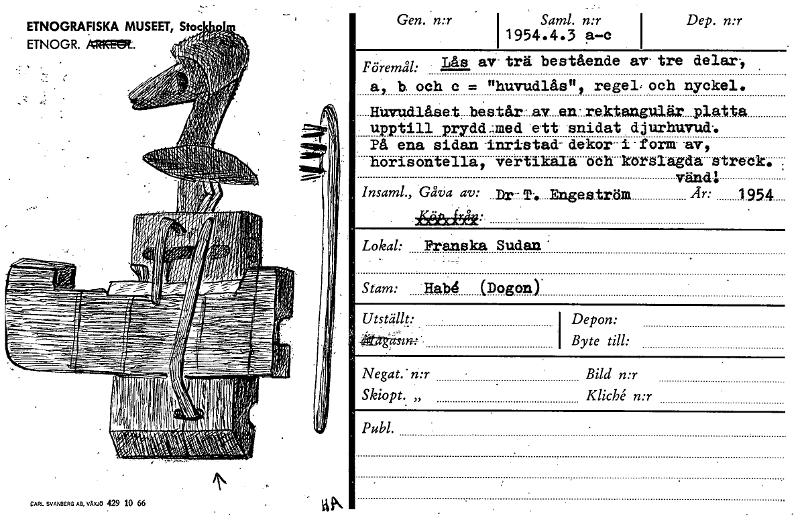 ETNOGRAFISKA MUSEET, Stoc ETNOGR. P;Riefert. CARL SVANBERG AB, VÄXJÖ 429 10 66 Gen. n:r Saml. n:r Dep. n:r •11954.4.3 a-o Föremål:  Lås av- trä bestående av- tre delar-, a, b. och c = "huvudlås", regel. och nyckel. Havudlåset består av en- rektangulär platta upptill  pryddmed ett snidat djurhuvud-. På ena sidan -inristad- dekor -i- form av, horisontella, vertikala oöh köreiagdastre19ek, vänd• Är:  54 Lokal: Franska Sudan Insaml., Gåva av: ..1)r: _Enges.trö.m Stam: 'Habå (Dogon). Utställt:   Depon: Byte till: Negat. n:r   Bild n:r Skiopt „   Kliché n:r Publ. [ocr]