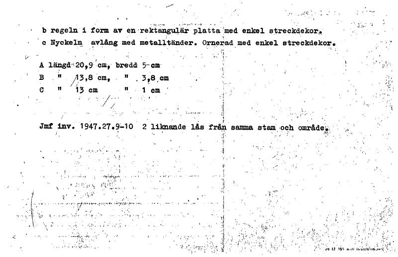 b regelni form av en .rektangulär platta; med enkel streckdekor. c Nyckeln avlång med metalltänder. Ornerad med enkel streckdekor.. • P. A längd- cm, bredd 5-cm B . " /13,8 cm, n . 3,8,cm 0 n /13 cm n...