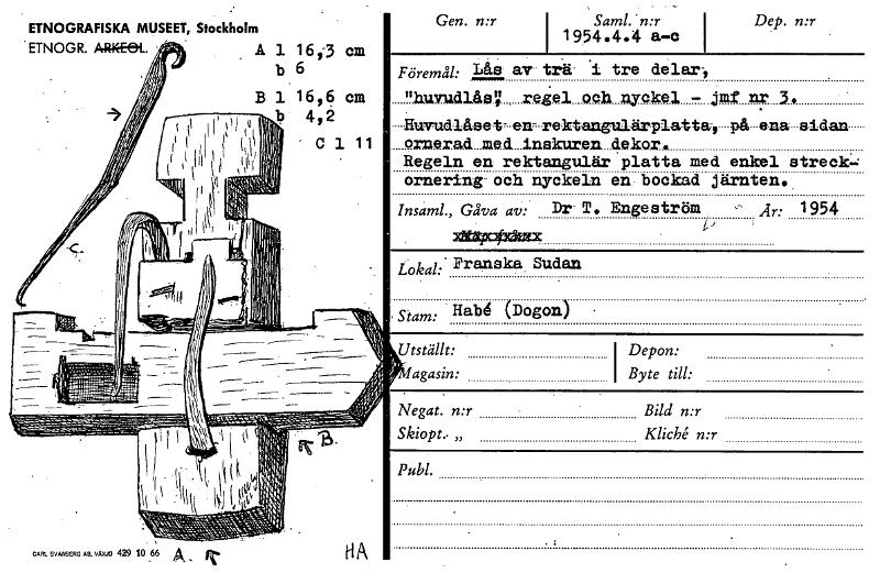 ETNOGRAFISKA MUSEET, Stockholm ETNOG R. .4414K-el..  A 1 1693 cm b 6 Dep. n:r Gen. n:r Saml.' n:r 1954.4.4 a—c 16,6 cm 4,2 C 1 11 Föremål: Lås  av trä- i tre delar; "huvu.dlåaV reiel....9ch. nyckel  -...