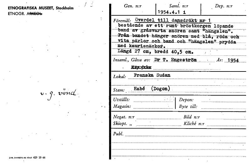 ETNOGRAFISKA MUSEET, Stockholm ETNOGR. A1f14€424 v tra"-KeL EARL SVANBERG AB. VAKS, 429 10 66 Gen. n:r I Saml. n:r Dep. n:r 1954.4.1 i Föremål: Överdel till dansdräkt- nr- 1 bestående av-ett-runt-bröstkorgen. löpande- band. av —gråsvarta snoren samt "hängslen". Trån-bandethängar-entren-med—blåt.röda.och vita pärlor och .band. och "hängslen" prydda -med.kaurisnäckor.. Längd 27 cm. 4 bredd 4015-cm. Insaml., Gåva av: Dr- T. Engeström • År: 1954 Lokal: Franska Sudan Stam: .11b6 (Dogon) Utställt': Depon: Magasin: I Byte till: Negat. n:r Bild n:r Skiopt. „ Kliché. n:r Publ. [ocr]Stäng