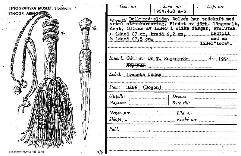 ETNOGRAFISKA MUSEET, Stockholm ' Gen. n:r I . Saml. n:r  . Dep. n:r 1954.4.8 a—b Föremål. Dolk- med- slida-. Dolken har träskaft med enkeIstreekortering. Bladet av-ttlth'i ''' långsmalt, 7&stat. Slidan :av läder i.olika-fåtgerayslutas- _a_längd_27_onli_bredd...:21.2 cm,  nedtill b längd 27,5 cm.  med en lädeertofen. Insaml., Gåva av: Dr T,  Engeatr.ö.ni  År: 1954 • -7;k92959% Lokal:  Franska Sudan Stam: ...11e14 (DMA) Utställt:   Depon: Magasin:   I Byte till: .Negat.,n:r   Bild n:r Skiopt. „   Kliché•n:r Publ. EARL SVANBERG AB, VÄRJO 429 10 66 [ocr]