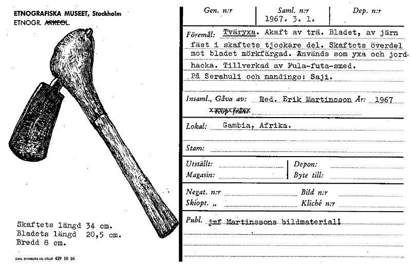 • CARL SVANBERG AB, VAX..10 429 10 66 I• Dep. n:r Gen. n:r I Saml. n:r 1967. 3. 1. Lokal: Gambia, Afrika. ETNOGRAFISKA MUSEET, Stockholm ETNOGR. ~et. Föremål: Tväryxa. Akaft av trä. Bladet, av järn fäst... Visa hela