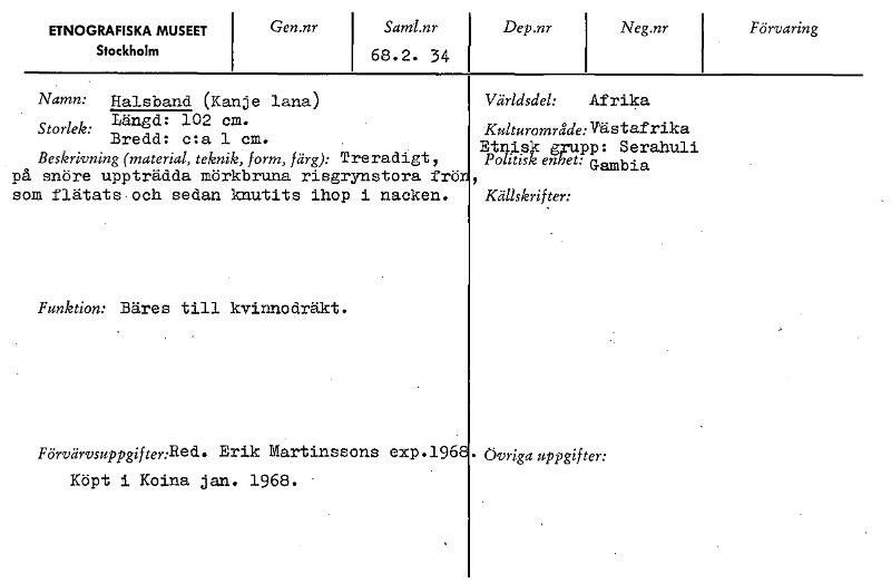 ETNOGRAFISKA MUSEET Stockholm Gen.nr Saml.nr 68.2. 34 Dep.nr Neg.nr Förvaring Namn: Halsband (Kanje lana) Storlek: Längd: 102 cm. Bredd: c:a 1 cm. Beskrivning (material, teknik, form, färg): Treradigt på snöre uppträdda mörkbruna risgrynstora frö som flätats och sedan knutits ihop i nacken. Funktion: Bäres till kvinnodräkt. Förvärvsuppgifter:Red. Erik Martinssons exp.196 Köpt i Koina jan. 1968. Världsdel: Afrika Kulturområde:n.staf rika Etnisk grupp: Serahuli Politisk enhet: Gambia Källskrifter: • Övriga uppgifter: [ocr]Stäng