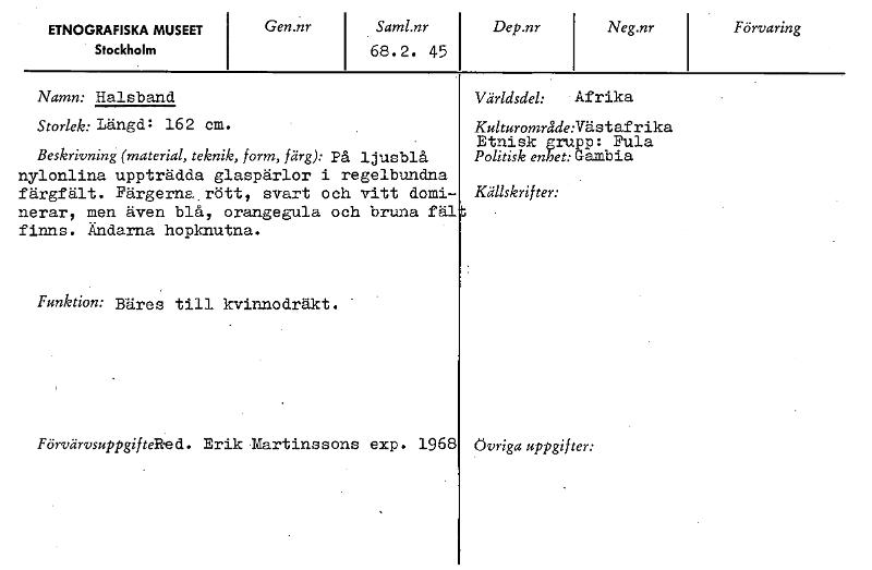 ETNOGRAFISKA MUSEET Stockholm Gen.n r Saml.nr 68.2. 45 Dep.nr Neg.nr Förvaring Namn: Halsband Storlek: Längd: 162 cm. Beskrivning (material, teknik, form, färg): På ljusblå nylonlina uppträdda glaspärlor i regelbundna färgfält. Färgerna rött, svart och vitt domi- nerar, men även blå, orangegula och bruna fäl finns. Ändarna hopknutna. Funktion: Bäres till kvinnodräkt. FörvärvsuppgifteRed. Erik Martinssons exp. 1968 Världsdel: Afrika Kulturområde:Väst af rika Etnisk grupp: Fula Politisk enhet: Gambia Övriga uppgifter: Källskrifter: t • [ocr]
