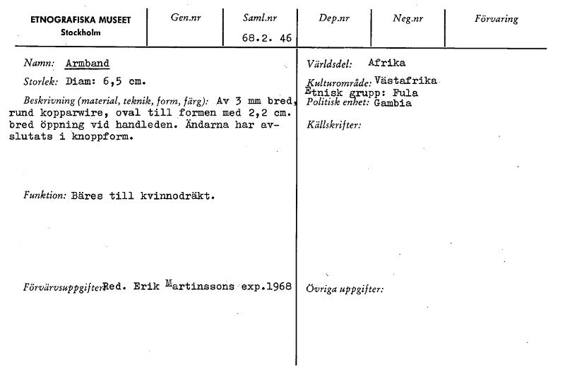 ETNOGRAFISKA MUSEET Stockholm Gen.nr Saml.nr 68.2. 46 Dep.nr Neg.nr Förvaring Namn: Armband Storlek: Diam: 6,5 cm. Beskrivning (material, teknik, form, färg): Av 3 mm bred, rund kopparwirey oval tillformen med 2,2 cm. bred öppning vid handleden. Ändarna har av- slutats i knoppform. Funktion: Bäres till kvinnodräkt. FörvärvsuppgifterRed. Erik Martinssons exp.1968 Världsdel: Afrika Kulturområde. •Västafrika Etnisk grupp: Fula Politisk enhet: Gambia Källskrifter: Övriga uppgifter: [ocr]