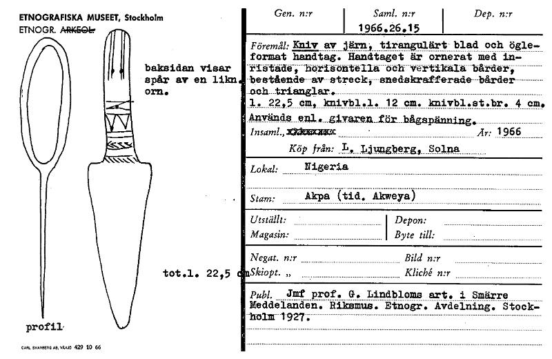 CARL SVANBERG AB, VAXJ0 429 10 66 ETNOGRAFISKA MUSEET, Stockholm ETNOGR. PeR.K.E.etn. baksidan visar spår av en likna OM. tot.l. 2295 Gen. n:r Saml. n:r i Dep. n:r I 1966,26,15 I Föremål:Kniv av järn...