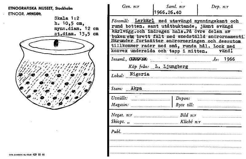 ETNOGRAFISKA MUSEET, Stockholm ETNOGR. Ams. Gen. n:r I Saml. n:r 1966.26.40 Dep. n:r Skala 1:2 h. 10,5 cm, mynn.diam. 12 em st.diam. 13,5 cm Föremål: Lerkärl med utsvängd mynningskant och rund botten....