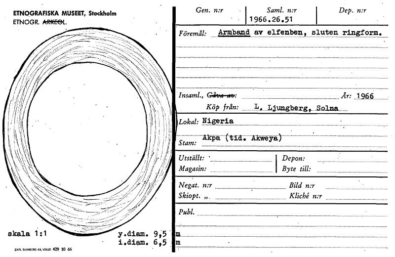 Depon: Byte till: Utställt: ' Magasin: ETNOGRAFISKA MUSEET, Stockholm ETNOGR. ARKEOL. Gen. n:r I Saml. n:r 1966.26.51 Dep. n:r y.diam. 9,5 i.diam. 6,5 CARL SVANBERG AB, VÄXJÖ 429 10 66 Föremål: Armba...