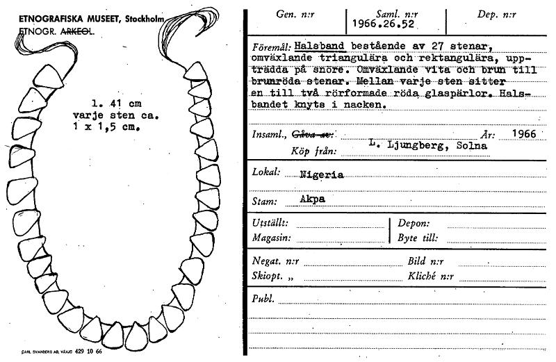 ETNOGRAFISKA MUSEET, Stockholm TNOGR. AR44€43L. Gen. n:r i 1966S.a2m61.5nr I Dep. n:r 1. 41 cm varje eten ca. 1 x 1 95 cm. Föremåk Halsband bestående av 27 stenar-, -omväxlande -triangulära och-rektangulära, upp- -tradda på snore Og:Växlande vita och brtlia till --brunröd-a---etenar. Mellan varje s-t-en- -Sitter r bandet knyts i nacken. Insaml., Gefsee~. Köp från: Är: 1966 1. Ljungberg, Solna Lokal: Stam: Nigeria AkP a Utställt: Magasin: Depon: I Byte till: Negat. n:r Skiopt. „ Bild n:r KlicIM n:r Publ. pARL SVANBERG AB, Vikit/ 429 10 66 [ocr]Stäng