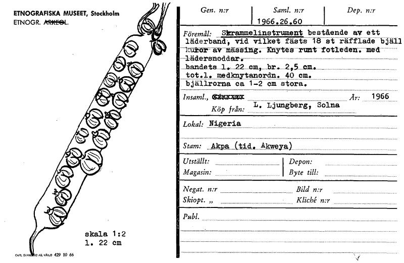 Dep. n:r Gen. n:r I Saml. n:r 1966.26.60 Föremål: Skrammelinstrument bestående av ett läderband, vid vilket fästs 18 st räfflade bjä11 kutor-av mässing. Knytes runt fttleden. med lädersnoddar. _bandet...Visa hela