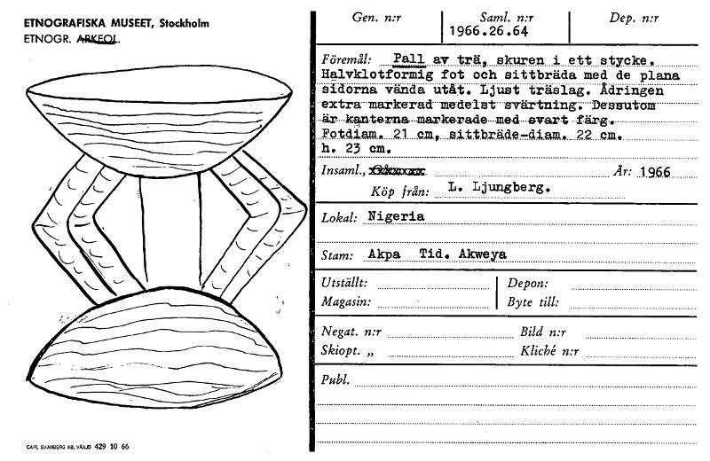 ETNOGRAFISKA MUSEET, Stockholm ETNOGR. Gen. n:r I Sam!. n:r Dep. n:r 1966 .26 .64 Föremål: Pall av trä, skuren i ett stycke, Halvklotformig fot och sittbräda med de plana sidorna vånda utåt. Ljus...