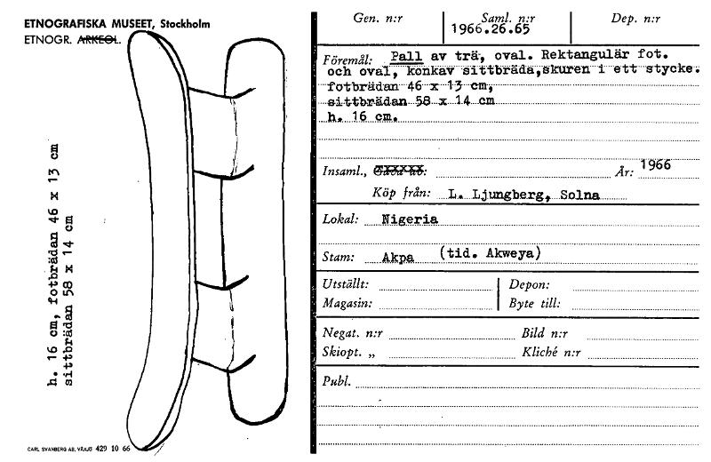 nt 0 g d- k P 43 03 oLn • g ,o o :cd k.° P • 4.1 o Gen. n:r I 19665261Ar I Dep. n:r Föremål: Pall av trä-I oval. Rektangulär fot. och oval, konkav sittbrädaokuren i ett stycke. -fotbräden 46 x 13 -em, -aittb-rädan 38. x 14 cm .h. 16 cm, Insaml., $332;1149:5: Köp från: Ar: 1966 1.1....Ljungbe.rgf..Solna Lokal: Stam: Nigeria Akpa (tid. Akweya) Utställt: Magasin: Depon: Byte till: Negat. n:r Bild n:r Skiopt. „ Klich‘. n:r Publ. ETNOGRAFISKA MUSEET, Stockholm ETNOGR. ACK-4k. CARL SVANBERG AB. VAXX 429 10 66 [ocr]