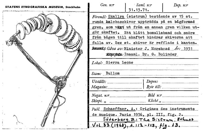 Gen. n:r I .Saml, I 31.13.71. STATENS ETNOGRAFISKA MUSEUM. Stockholm Dep. n:r Ry;remdk Skallra (sistrum) bestående av 15 st. runda kalebasskivor uppträdda på en bågformad Aren, som väst' ut från en a...