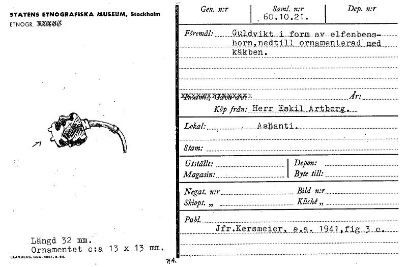 • STATENS ETNOGRAFISKA MUSEUM, Stockholm ETNOGR. Mfflag Gen. n:r Sam!. n:r I _ 60.10.21. Dep. n:r Föremål: Guldvikt. .1... form av elf eriUns- horn, nedtill ornamenterad med käkben. 3797/47.);niczäWx ... Visa hela