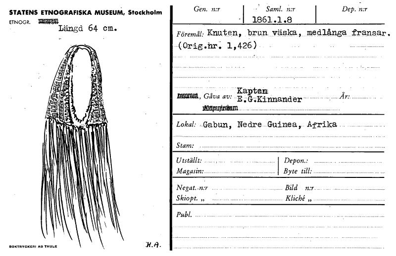 STATENS ETNOGRAFISKA MUSEUM, Stockholm ETNOGR. =ffi Längd 64 cm. Gen. n:r ISaml. n:r ' I 1861.1.8 Föremål: Knuten, brun. väska, medlånga fransar. •(Orig.hr. 1,426) Kapten ~El, Gåva av: E, G,Kinnander " År. ~lm Lokal: Gab an, Nedre Guinea,.. Afrika Stam: Utställt: Magasin: Negat..n:r . Bild n:r Skiopt. „ Kliché „ Publ. BOKTRYCKERI AB THULE Dep. mr Depon.: Byte till: [ocr]
