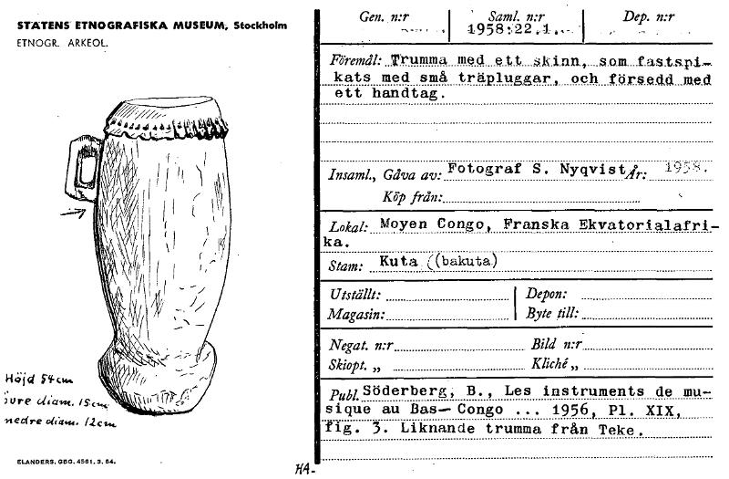 STATENS ETNOGRAFISKA MUSEUM, Stockholm ETNOGR. ARKEOL. H4 Höjd i-Y-ck" ,ure rtedre ait'4444• 11c1«. ELANDERS, 05G. 4561.3.84. Gen. n:r ---- . ' Saml. n:r 1958:,22.1 „- Dep. n:r Föremål: Trumma med ett...