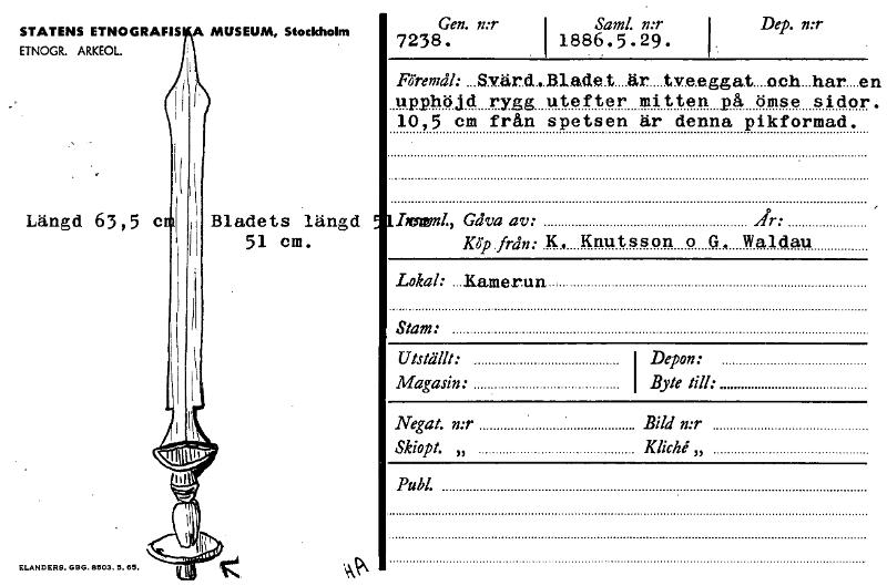 • STATENS ETNOGRAFIS A MUSEUM, Stockholm ETNOGR. ARKEOL. Gen. n:r 7238. SamL n:r 1886.5.29. Dep. n:r Längd 63,5 Bladets längd 51 cm. ELANDERS.GME1503.5.89. Föremdh_Smärd tveeggat_och. har en upphöjd ryg... Visa hela